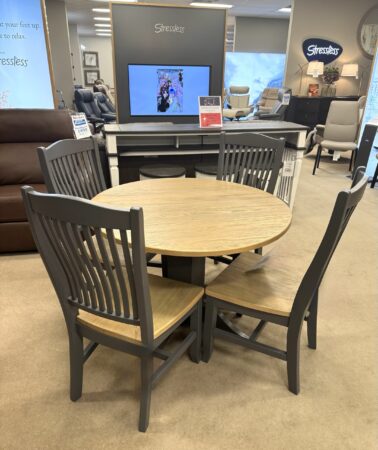 This 5-piece dining set includes a trestle table and four panel back chairs with padded, upholstered seats. The table features an 18-inch self-storing leaf with an easy-glide track system to accommodate more guests.