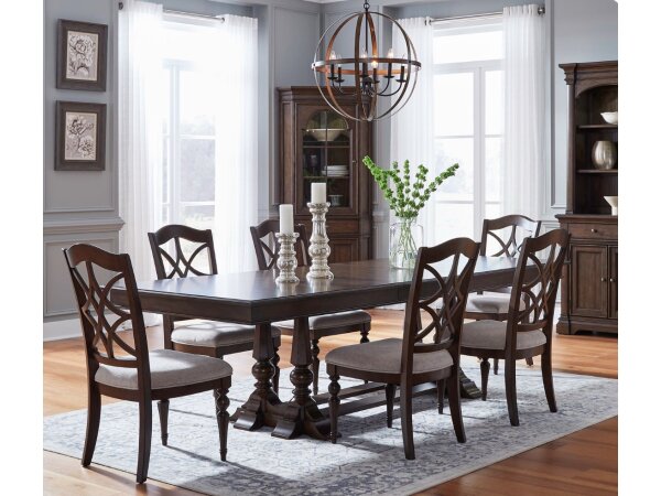 This Brook Creek 5-piece counter set for small spaces features a two-tone bookcase table with fixed shelves and four padded counter height stools. The stools have upholstered seats and antique brass nail head accents.