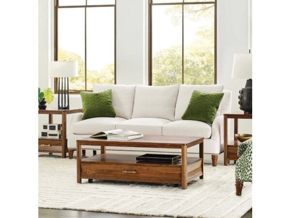 Crafted from rubberwood solids and white oak veneers, the Heartland rectangular cocktail table features an antique white and tobacco finish. It offers two full extension drawers, a slat shelf, and decorative ceiling tile inserts under glass.