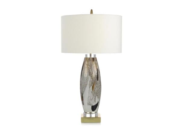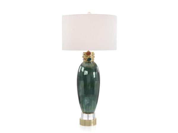 The intense hues of the semitranslucent emerald green shade are accented by the clear glass encircling the top of this shell-shaped bowl.