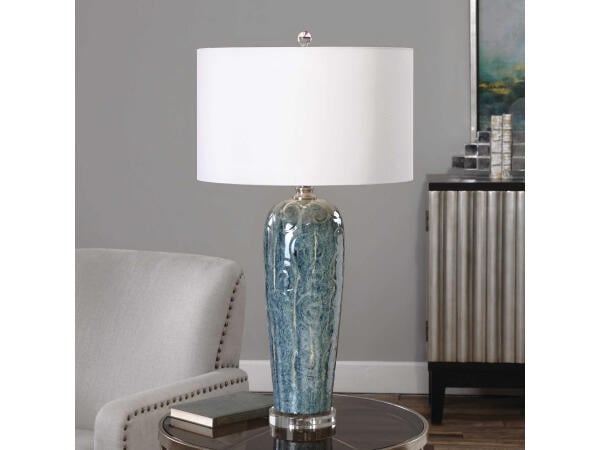 This classic table lamp is in melded white and cream standing on a lovely footed brass base.