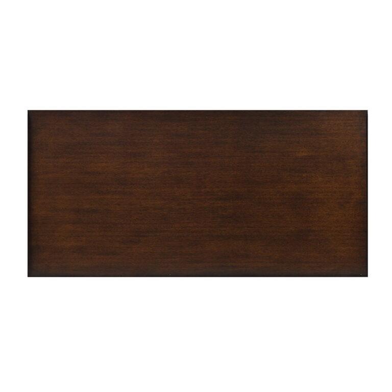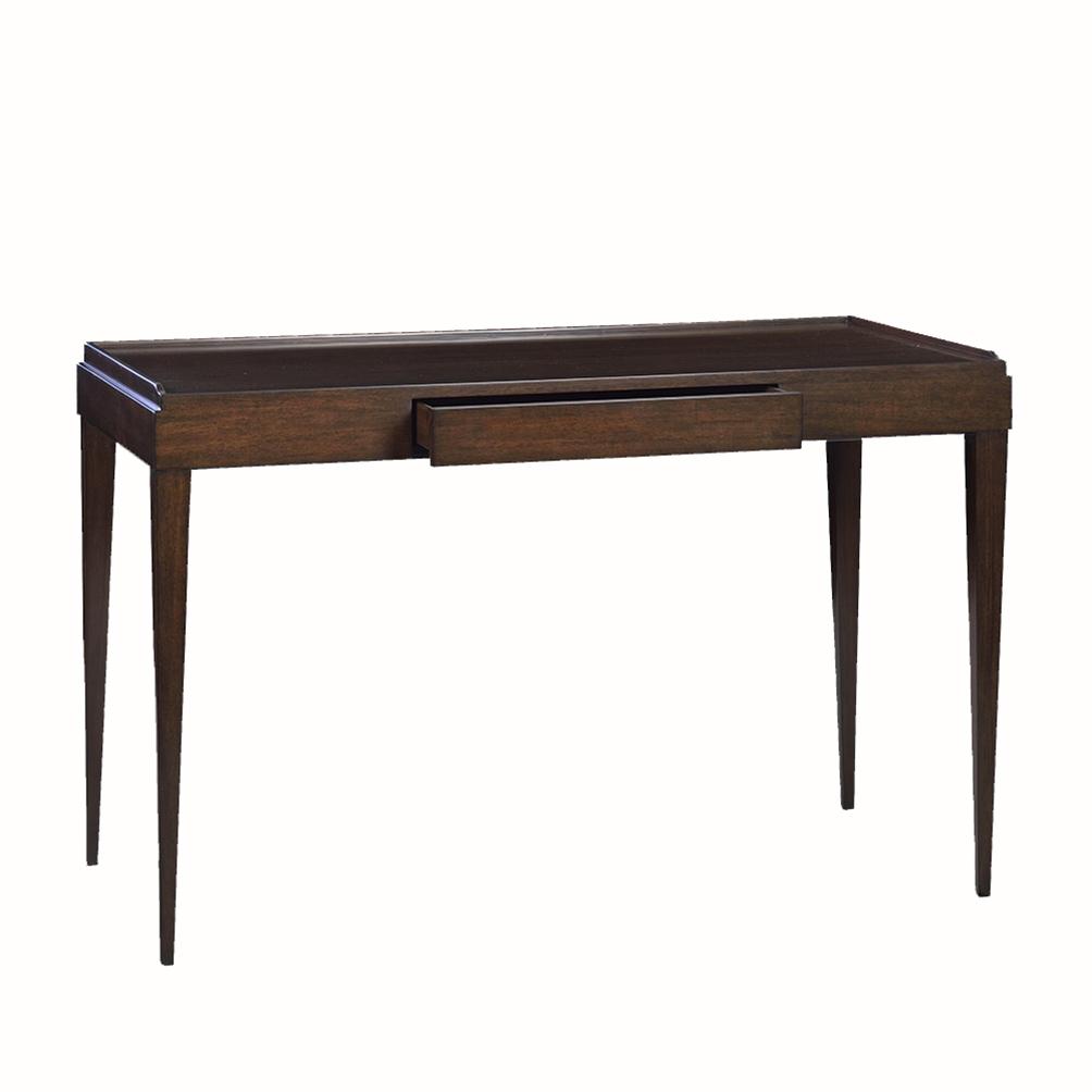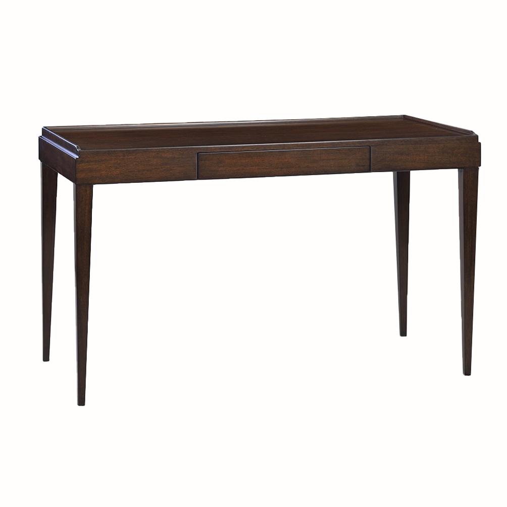 Lip desk with tapered legs, hidden drawer and lipped top, has a dark “chocolate” brown wood tone, hand-rubbed satin finish on Acacia crown veneer and Acacia solids.