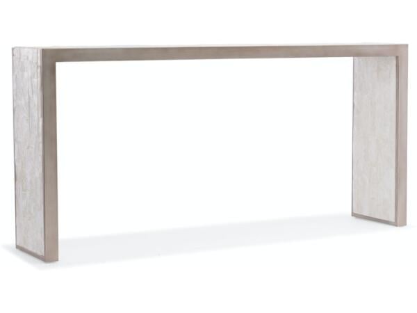 Inspired by European antiques, the intricately-designed Traditions Console Table combines a metal base in a Verdigris finish with a gray and brown Travertine Stone veneer top. The twisted metal legs and stretchers are accented by a circular motif in the center of each stretcher on the base. 68.25W X 11.25D X 32.50H